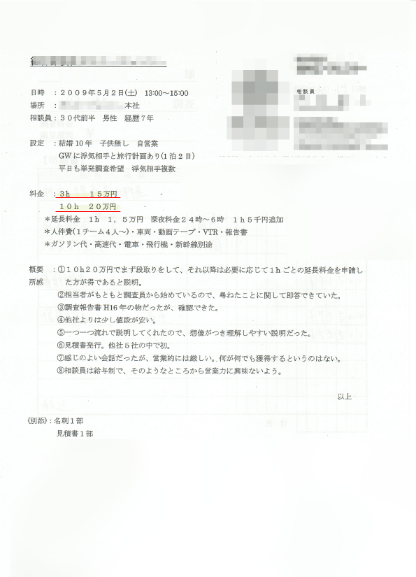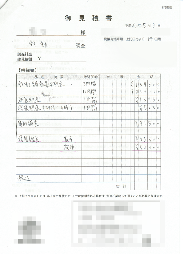 A社の他社調査料金見本